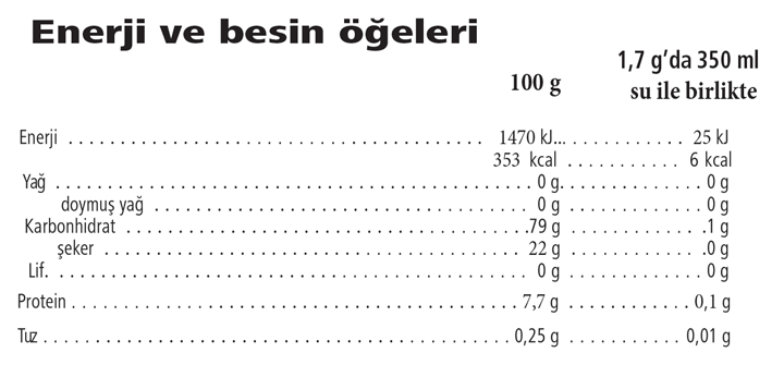 Maltodekstrin, fruktoz, siyah çay yaprağı ekstresi (Camellia sinensis, % 14,7), doğal limon aroma vericisi (% 7), yeşil çay yaprağı ekstresi (Camellia sinensis, % 6,9), kakule meyvesi ekstresi (Elettaria cardamomum, % 0,4), toz bamya çiçeği (Hibiscus sabdariffa, % 0,1), ebegümeci yaprağı ekstresi (Malva sylvestris, % 0,1).